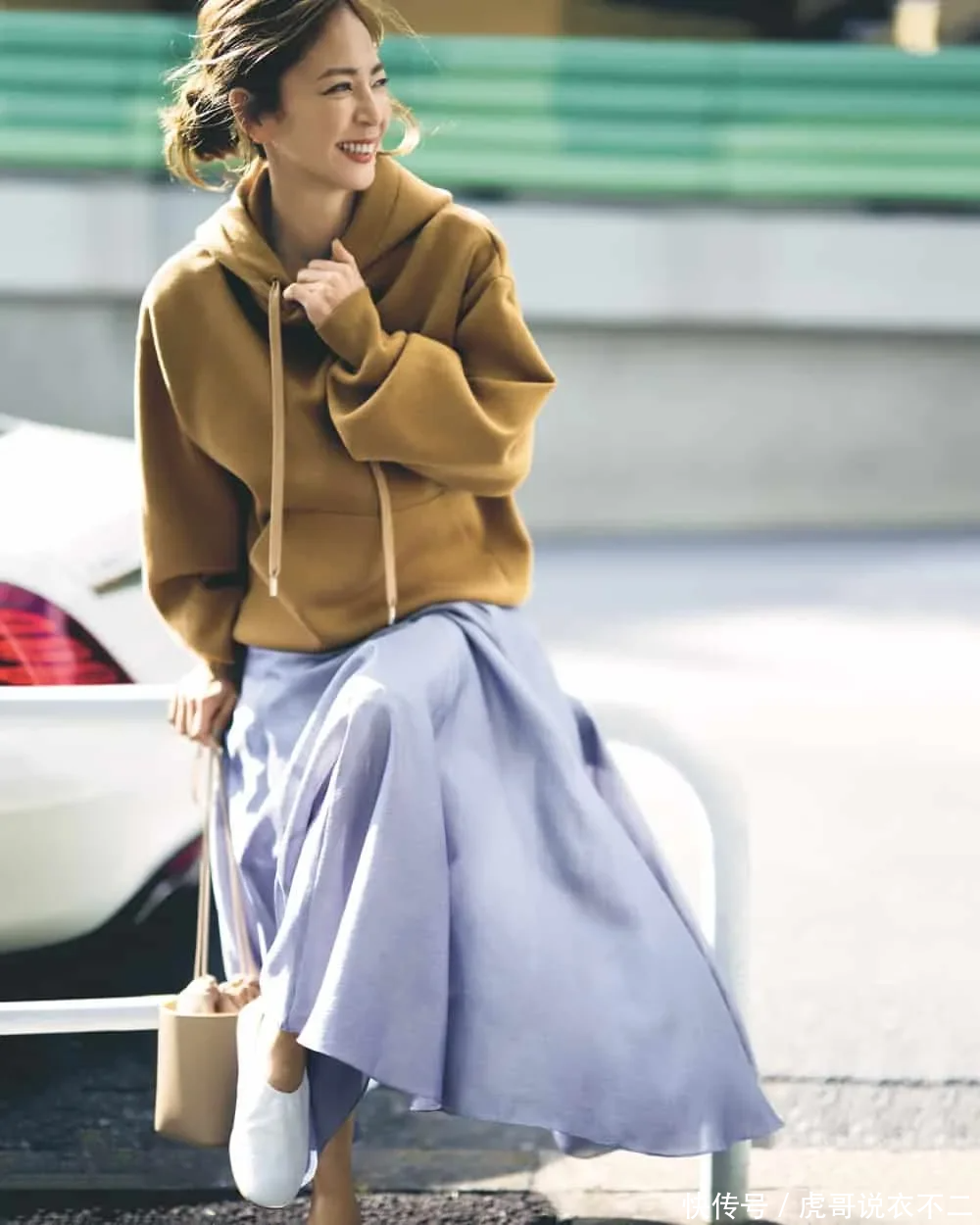 例如,一件驼色的连帽卫衣,搭配一条浅蓝色的丝绸百褶裙,同色系的不同深浅层次,既简约又不失层次感,脚踏一双白色运动鞋,既舒适又减龄,无论是日常出行还是约会聚餐,都能让你成为焦点。